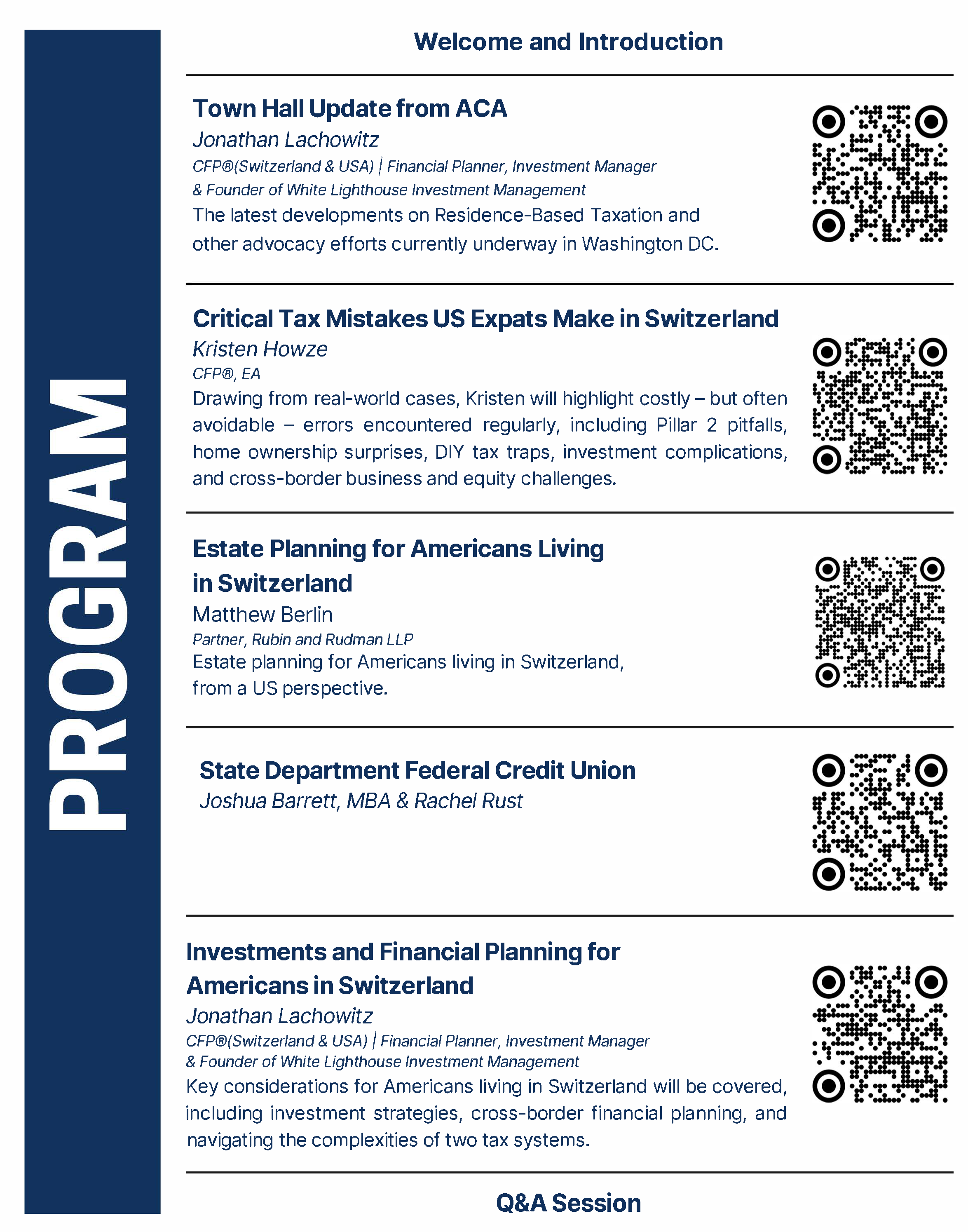 Jonathan LachowitzTown Hall Update from ACA Jonathan will open the town hall with an update from American Citizens Abroad (ACA). He will share the latest developments on Residence-Based Taxation and other advocacy efforts currently underway in Washington DC. Investments and Financial Planning for Americans in Switzerland To close the town hall, Jonathan will turn to wealth management. He will discuss key considerations for Americans living in Switzerland, including investment strategies, cross-border financial planning, and navigating the complexities of two tax systems. Jonathan is a CFP® Professional (Switzerland & USA), Financial Planner, Investment Manager & Founder of White Lighthouse Investment Management. Jonathan and his White Lighthouse team work with several hundred Americans and mixed-nationality families in Switzerland for their investment management and financial planning needs. He is also the Chairman of American Citizens Abroad. |