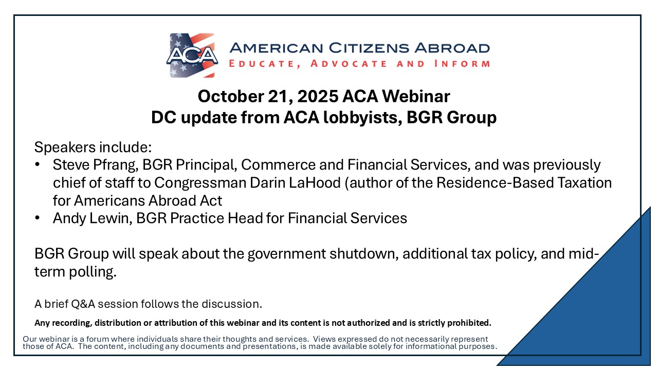 On October 21, 2025, members of ACA heard from our Washington, DC based lobbyist, the BGR Group, about efforts in support of Residence-Based Taxation (RBT). Work on RBT continues even during the government shutdown. ACA Global Foundation (ACAGF) has commissioned a research study to help educate Congress and the Administration with RBT modeling and revenue estimates. ACA will use this research in its meetings with Congressional offices and with the tax writing committees, in particular, the Joint Committee on Taxation (JCT).